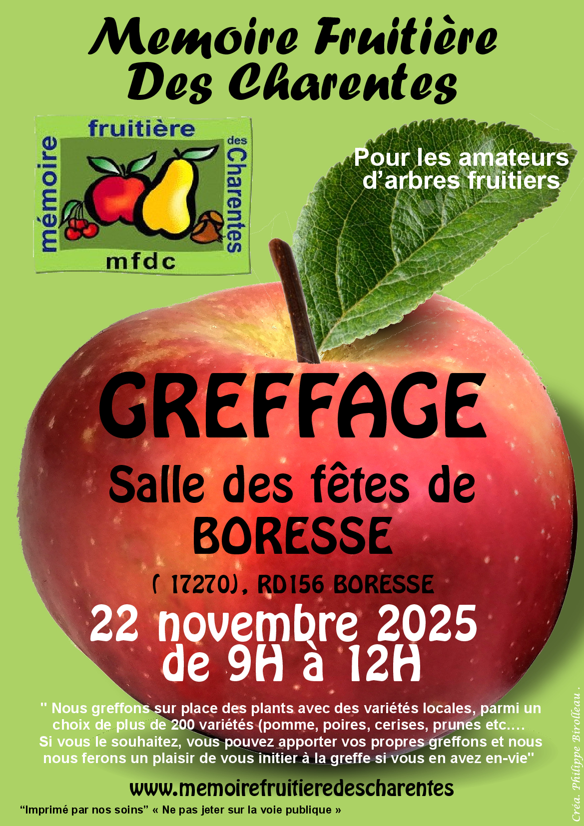 - 22 novembre 2025 : greffage à Boresse et Martron (17), salle des fêtes de Boresse, de 9h à 12h , FRUITIERS A NOYAUX, matin uniquement